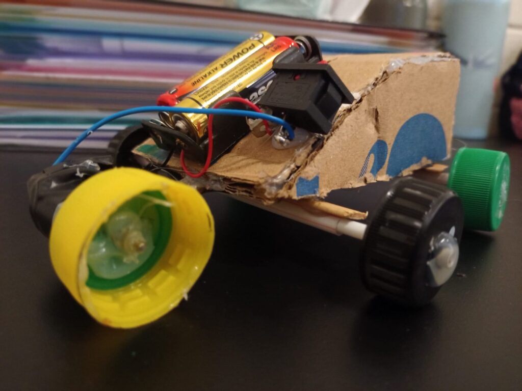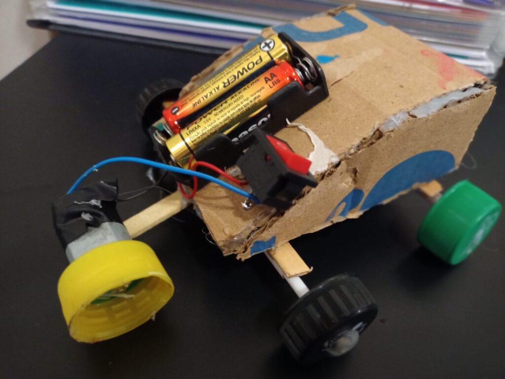 Nós estávamos fazendo essa pesquisa e um amigo nos deu a ideia de fazer um carinho utilizando um circuito simples. Montamos então um carro utilizando papelão e um circuito pronto, retirado de um carrinho antigo. A produção e o modo de fazer você pode observar no vídeo.